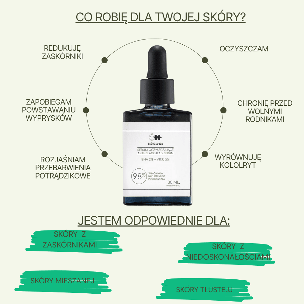 Serum odpowiednie do skóry tłustej, mieszanej, z niedoskonałościami, z zaskórnikami.