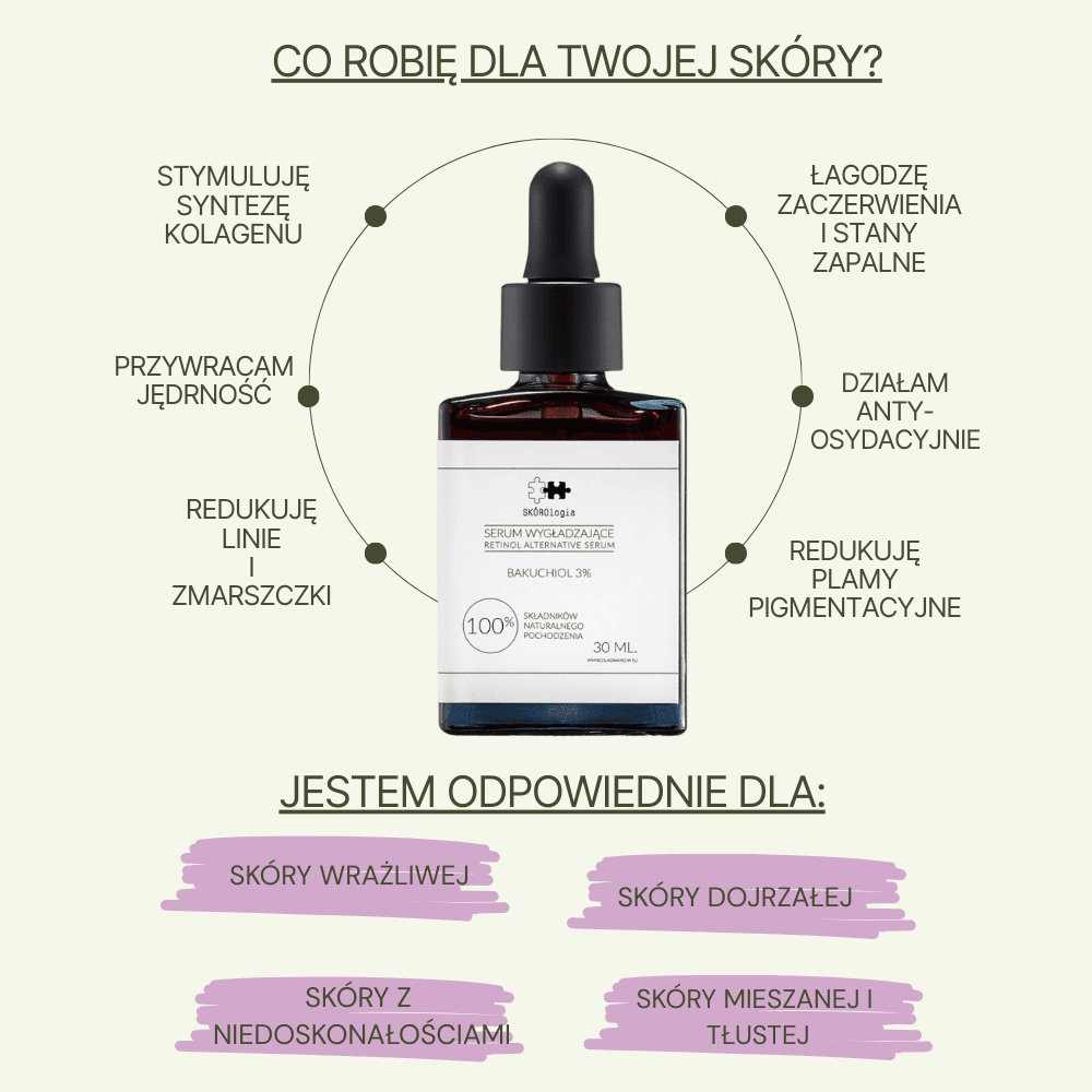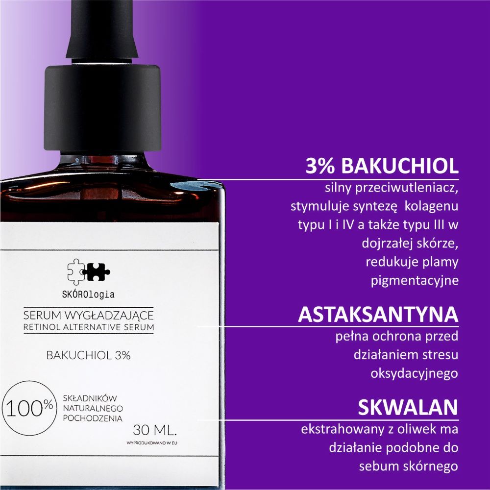 Serum Wygładzające Bakuchiol 3%, alternatywa dla retinolu, redukuje drobne linie i zmarszczki, stymuluje produkcję kolagenu i odnowę komórek oraz zmniejsza stany zapalne i zaczerwienienia, przywracając jędrność i gładkość skóry. Wzbogacone o astaksantynę, najsilniejszy przeciwutleniacz, 6000 razy skuteczniejszy od witaminy C, jako naturalna tarcza chroni przed promieniowaniem UV i uszkodzeniami komórek oraz kolagenu. Fotostabilne, idealne do stosowania w dzień i w nocy dla efektu odmładzającego. Doskonałe dla osób z nietolerancją witaminy A, w tym kobiet w ciąży i karmiących