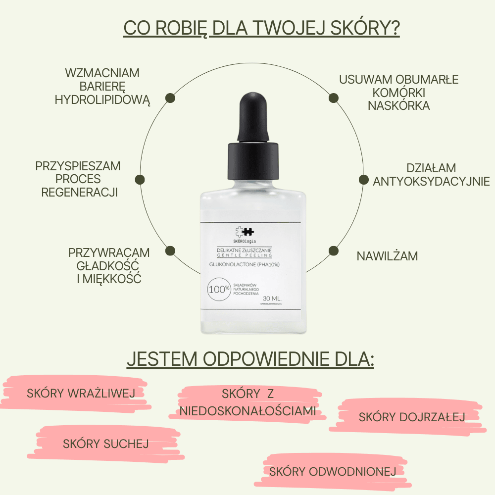 Szukasz skutecznego, ale jednocześnie bezpiecznego peelingu, który nie podrażni Twojej delikatnej cery? Serum Złuszczające (PHA) 10% – Gentle Peeling zostało stworzone z myślą o właśnie takich potrzebach. Przede wszystkim formuła oparta na glukonolaktonie (PHA) delikatnie złuszcza, a przy tym nawilża i wzmacnia barierę skórną. Dzięki temu zapewnia kompleksową pielęgnację nawet dla skóry atopowej i reaktywnej.